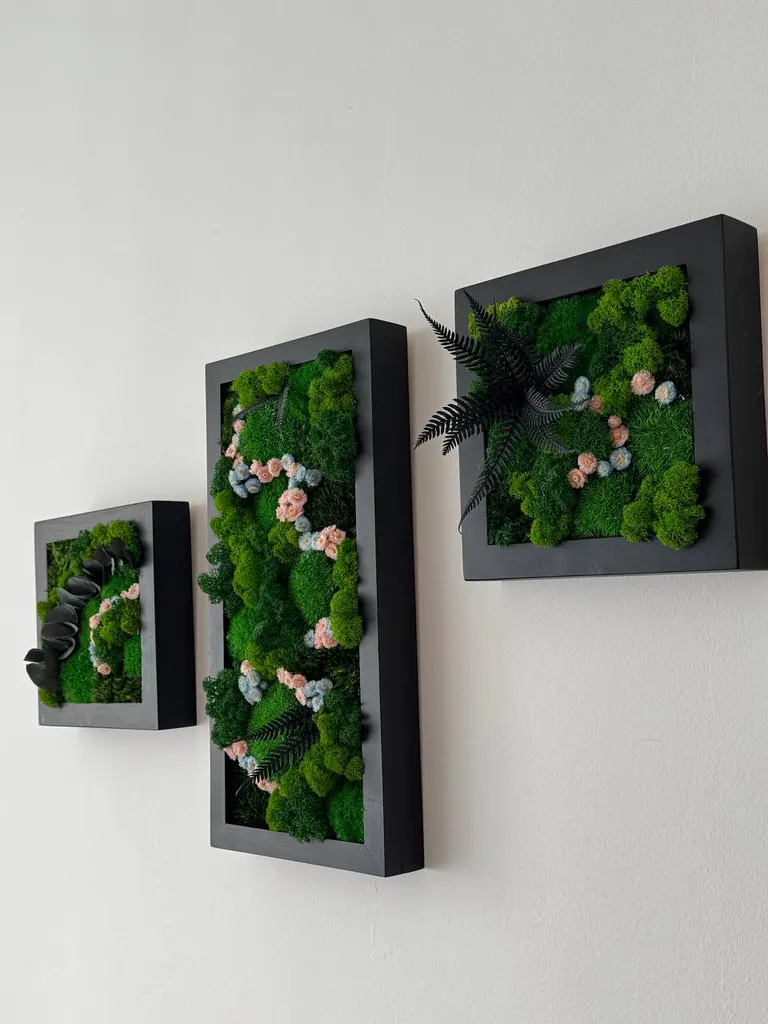 De kracht van deze set ligt in het samenspel van vormen: twee vierkante lijsten flankeren een langwerpig middenpaneel (in een 2:1-verhouding). Alle drie zijn ze omlijst met stevige zwarte massiefhouten kaders, die de levendige kleuren van het geconserveerde mos prachtig accentueren.