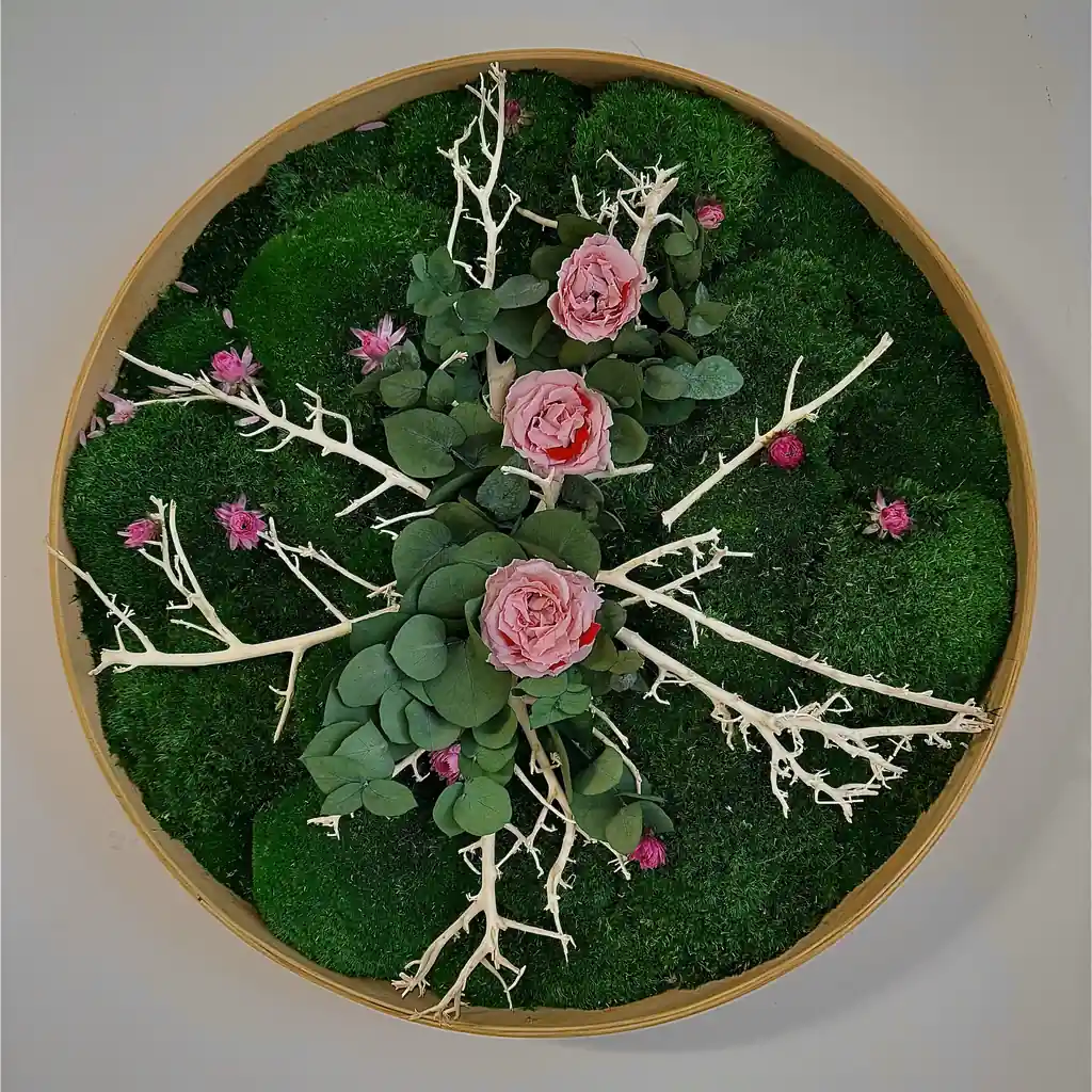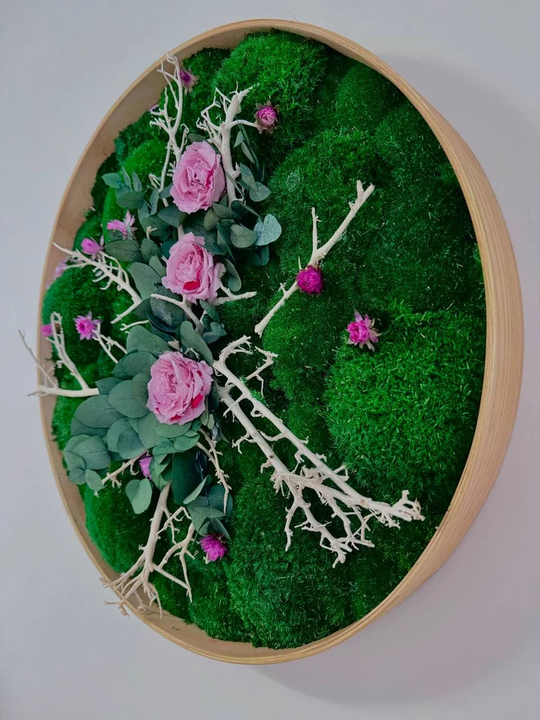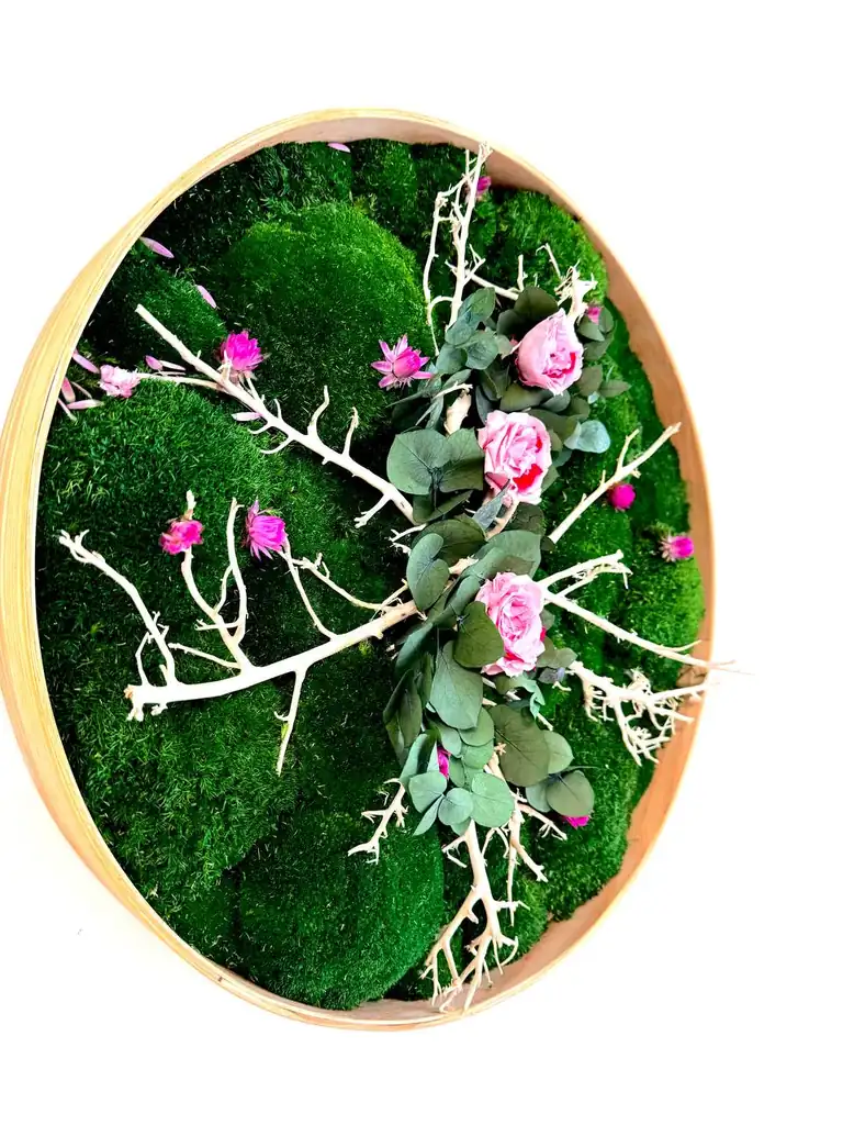 Breng een uniek natuurkunstwerk in uw interieur dat de schoonheid van gestabiliseerd mos en delicate rozen combineert. Dit ronde kunstwerk is ingelijst in een dun, elegant frame van eiken- of essenhout en verkrijgbaar in diameters van 45 cm tot 150 cm. De volledige basis is bedekt met weelderig bolmos, waarlangs fijne houten takjes zich slingeren, tussen de groene bladeren en zachtroze, geconserveerde rozen die tevoorschijn komen.