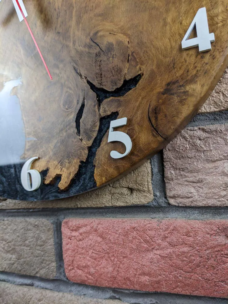 Belangrijke opmerking: elke klok is een handgemaakt uniek stuk. De foto’s tonen één van de mogelijke variaties van het ontwerp. Door de natuurlijke houtnerf van het eikenhout en de unieke structuur van de epoxyhars kan uw exemplaar licht afwijken van het afgebeelde model – juist dat maakt de charme van dit handwerk uit.