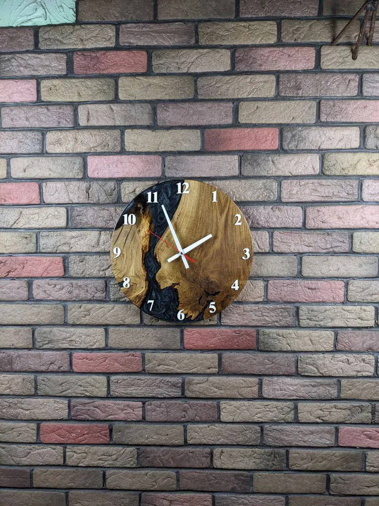 De zwarte epoxyhars wandklok past zowel bij moderne lofts als bij klassiek ingerichte ruimtes. Het natuurlijke eikenhout straalt warmte en authenticiteit uit, terwijl het diepe zwart met parelmoer een luxueuze, eigentijdse toets toevoegt.