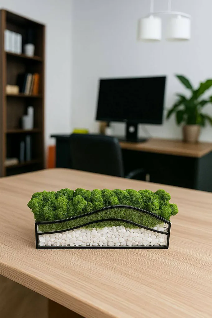 Het Mos in glas โ Kleurenoase past zich moeiteloos aan elk interieur aan. Of het nu als accent op uw bureau staat, als harmonieus detail in de woonkamer of als inspirerend element op kantoor โ overal zorgt het voor natuurlijke elegantie en brengt het kleur in het dagelijks leven. Dankzij de heldere glasvorm past dit arrangement zowel in minimalistische als speelse omgevingen perfect.