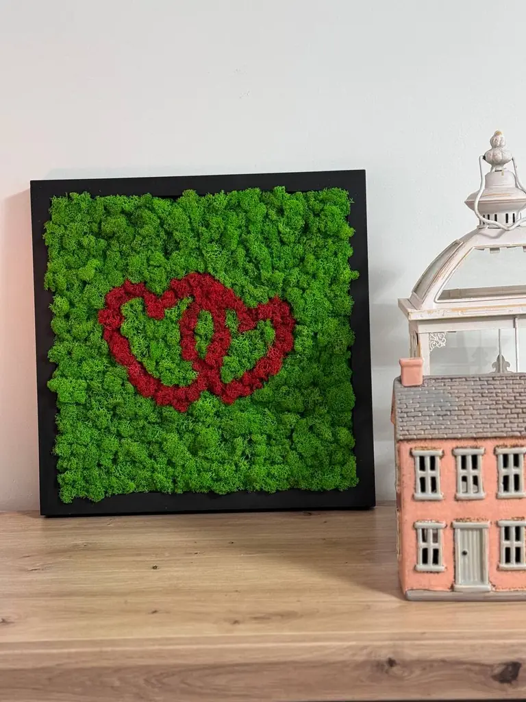 Een moshart-wanddecoratie is een unieke en emotionele manier om liefde uit te drukken en elke ruimte een bijzondere sfeer te geven. Dit kunstwerk is gemaakt van echt, geconserveerd IJslands mos, dat er altijd fris uitziet en geen onderhoud nodig heeft. Het motief toont twee in elkaar verstrengelde harten, die in een rood tint oplichten en prachtig contrasteren met het rijke groen van het mos.