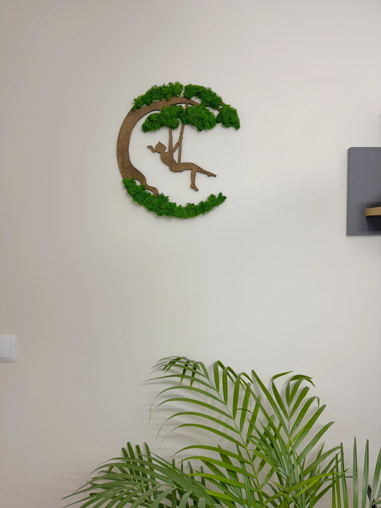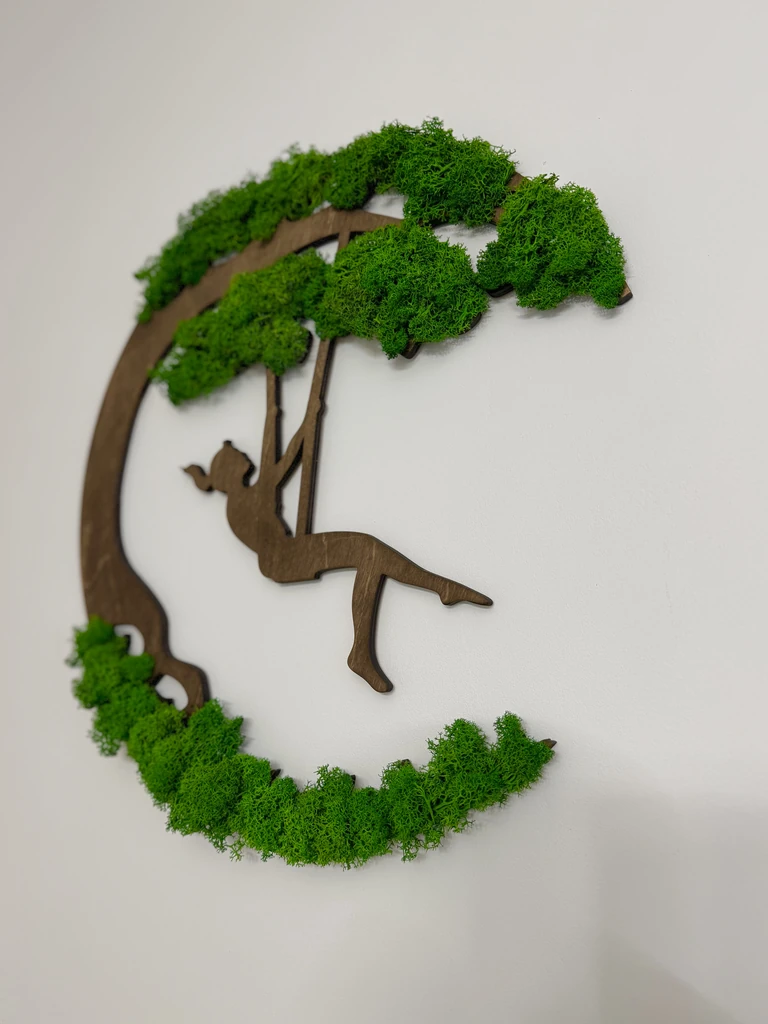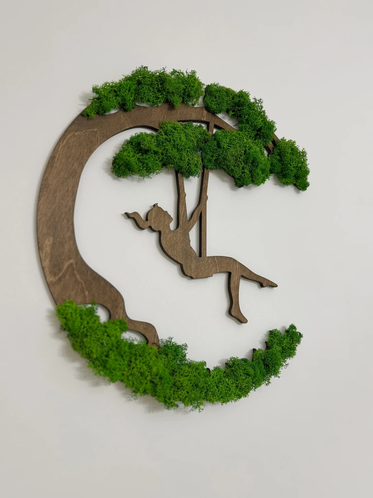 Zoekt u een bijzondere blikvanger die perfect bij uw stijl past? Het mosschilderij “Meisje op Schommel” van Ekomoss is een handgemaakt kunstwerk dat wij volledig naar uw wens aanpassen. Deze exclusieve moskunst combineert een elegant houten silhouet met echt, geconserveerd mos tot een tijdloos designobject voor uw interieur.