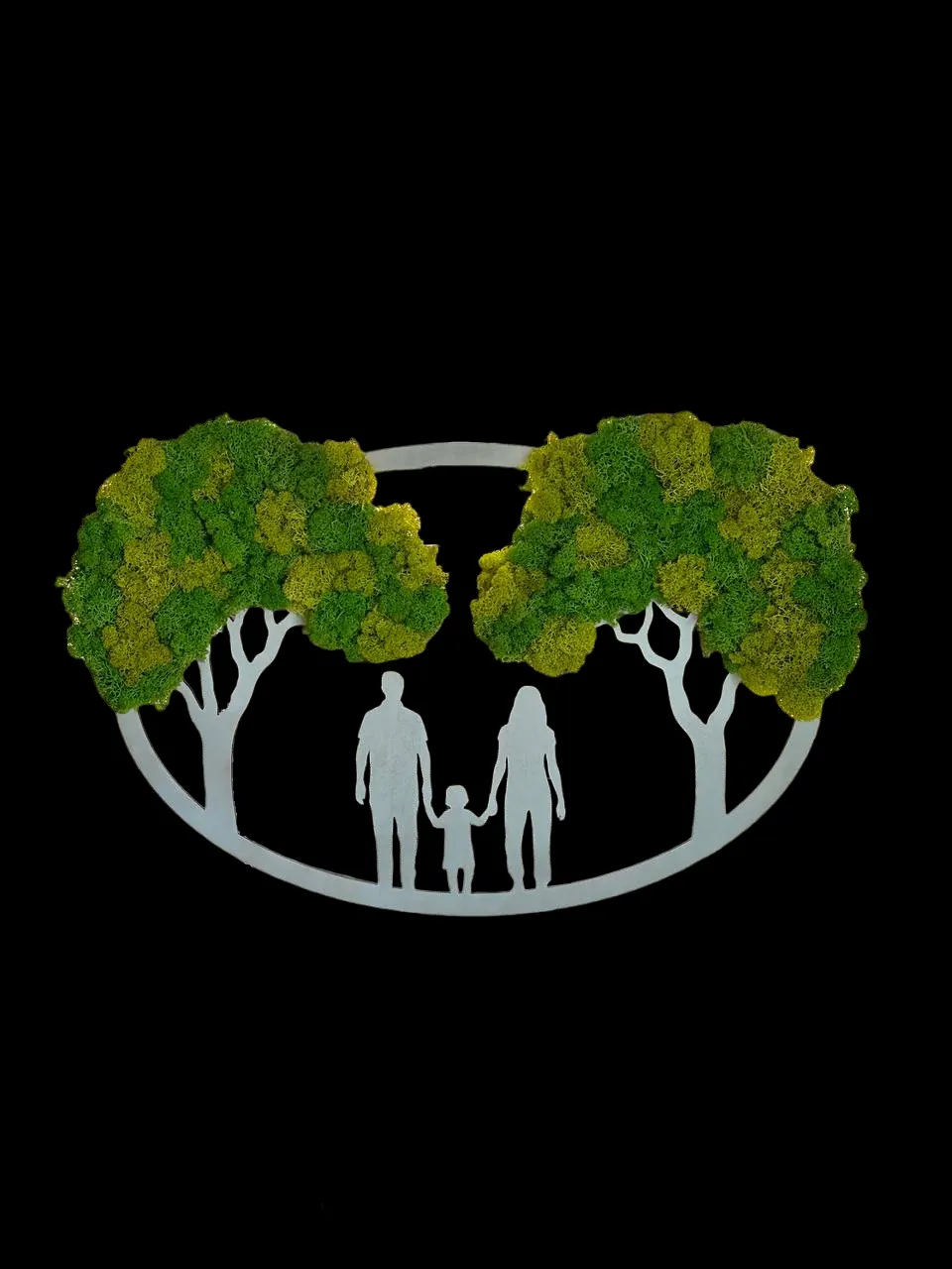 De basis van het schilderij is gemaakt van hoogwaardig, duurzaam sparrenhout. Aan beide zijden van het houten paneel zijn sierlijke boomkronen aangebracht, die zorgvuldig bedekt zijn met geconserveerd rendiermos. In het midden van het werk bevindt zich het hart van de familie – vader, moeder en kind – als symbool voor sterke wortels, verbondenheid en de continuïteit van familiewaarden.