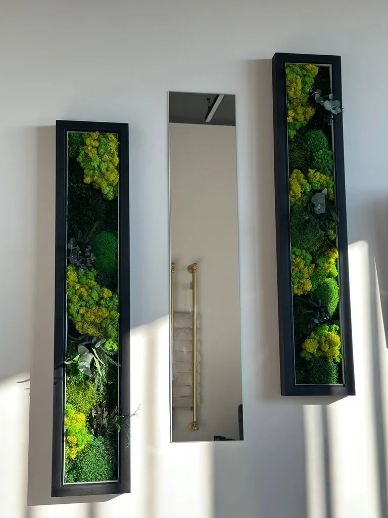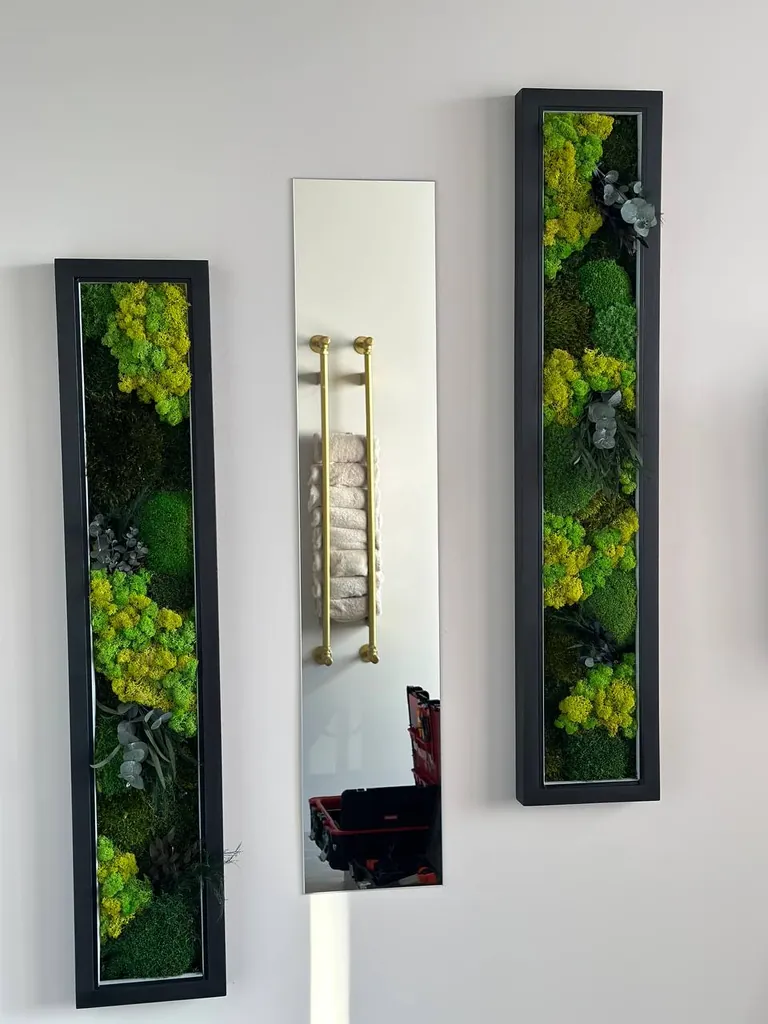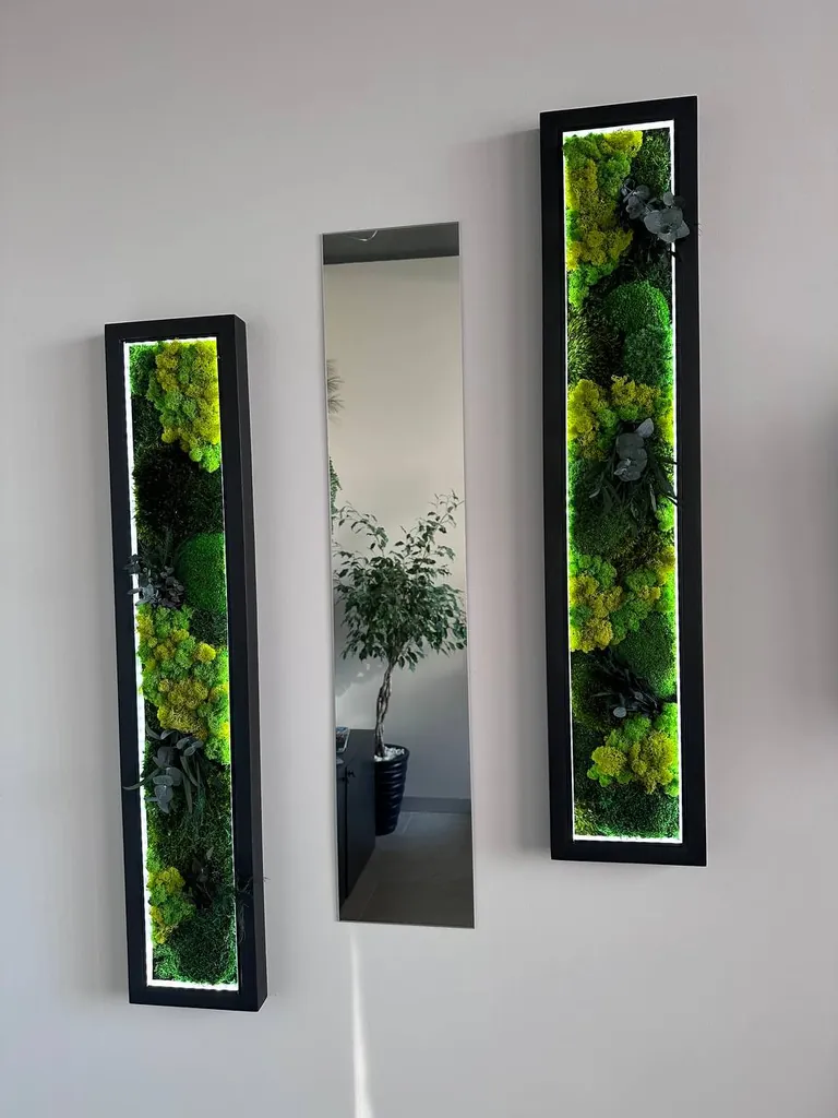 Het Set van schilderijen met mos en spiegel is een meesterlijke combinatie van kunst, natuur en functionaliteit. Het biedt een langdurige, onderhoudsvrije natuurlijke decoratie voor huis of kantoor, met maximale visuele impact. Door de keuze in formaten, framekleuren en optionele verlichting kan het geheel volledig aan uw interieur worden aangepast, waardoor elk set een unieke, stijlvolle en duurzame investering in natuurlijke schoonheid is.