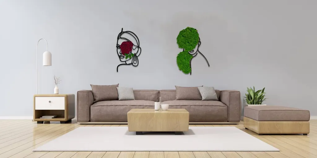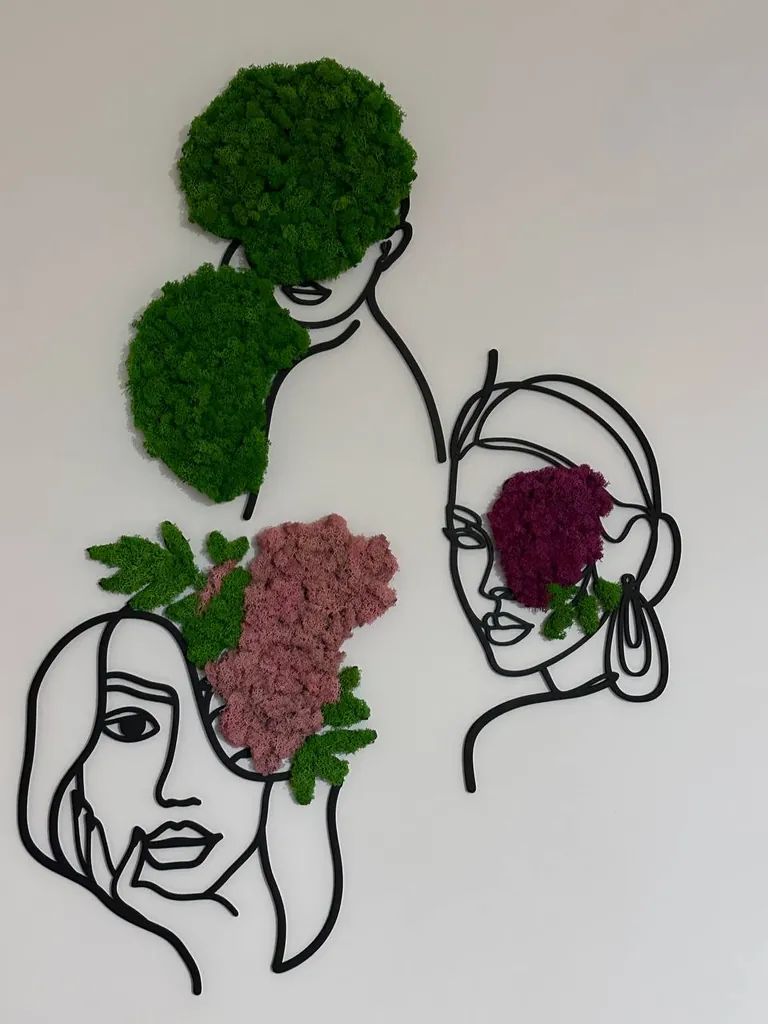 Dit uitzonderlijke vrouwenportret verenigt de tijdloze schoonheid van de natuur met een modern design. Het kunstwerk is gemaakt van 6 mm dik multiplex in zwart of wit en is artistiek versierd met rood en groen geconserveerd IJslands mos. Dankzij de harmonieuze combinatie van minimalistische lijnen en natuurlijke materialen ontstaat een uniek wandkunstwerk dat verfijning en originaliteit uitstraalt. Verkrijgbaar in afmetingen van 40 cm tot 100 cm, past dit kunstobject naadloos in elk interieur en vormt het een stijlvol alternatief voor traditionele schilderijen.