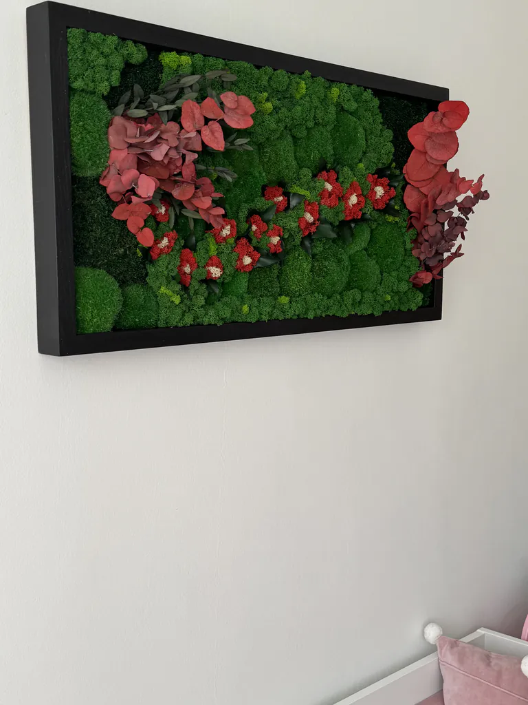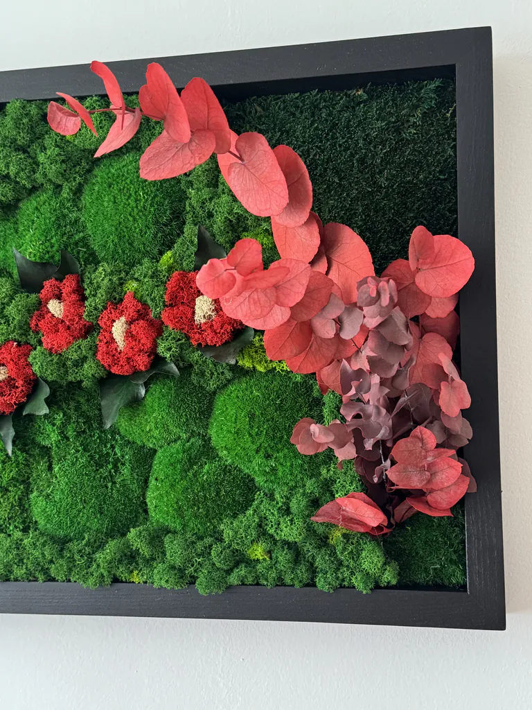 Wand mosschilderij met rode mosbloemen en eucalyptus– gedetailleerde beschrijving